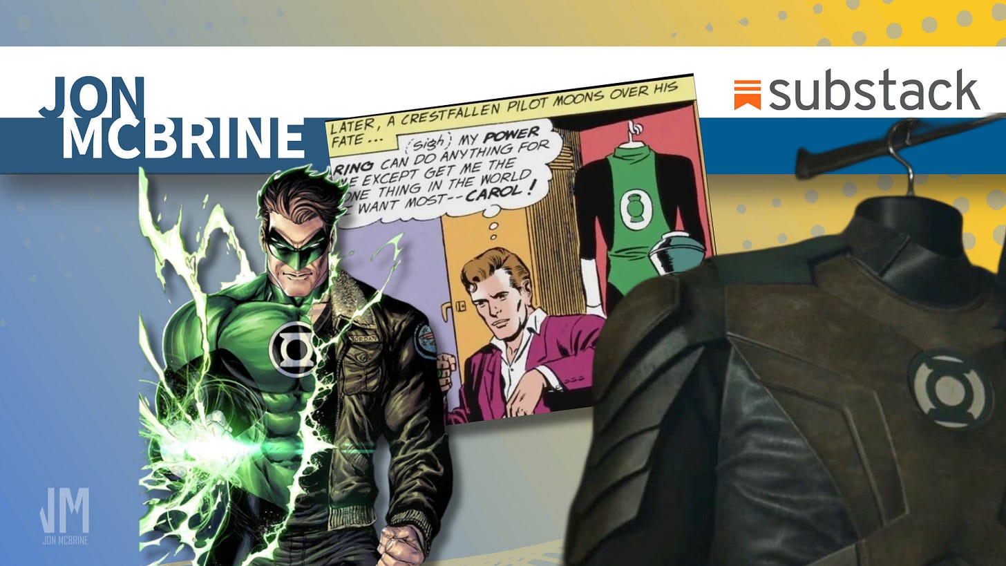 Whatever version of Power Ring-bearer Hal Jordan is presented here, whether or not he magically generates a costume or hangs his uniform in a closet - and cast aside whatever logic is used to explain why a famously green guy’s outfit is brown - his costume is simply an ugly design. In the teaser for the forthcoming HBO Max series geared toward adults (meaning it is full of weirdly-placed F-bombs), sector protector Hal’s dust-collecting duds are indeed faded and the color of, well, let’s just rename the show Lan-turds. Again, it doesn’t matter if he manifests it like in most versions, or if it is like in the older comics where it’s a physical piece of clothing he puts on. Whatever the case, the design smells like how it looks. It is a typical, lame live action suit that looks rubbery and full of busy, unneeded details. Rivets, sequins, lining, tubing, scales, textured material - every movie or TV super costume is pretty much the same. A lack of green energy surrounding Jordan as he flies in the preview is irksome but Nathan Fillion didn’t really have that jade aura in the Superman movie either. Both look ridiculous but at least Guy Gardner was in on the joke.