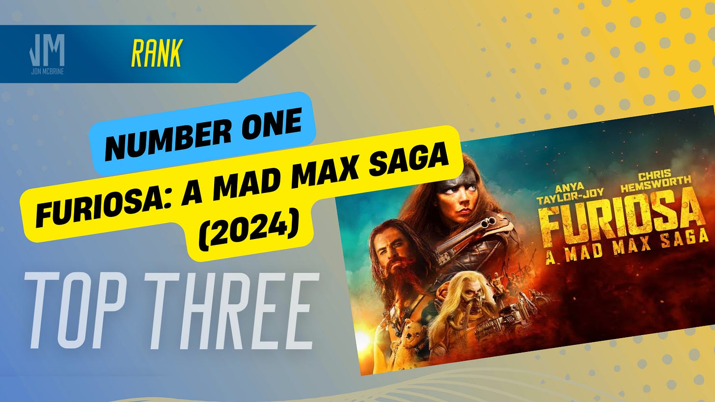 Number One: Furiosa: A Mad Max Saga. In 2024, yet another “A” spinoff/prequel was unleashed upon cinemas, and this time it was a whole saga. I always thought of sagas to be multiple entries, but this is the desert wasteland where there are no rules. Well, there is one rule - have fun! Okay, there’s one last rule - make a Mad Max movie that’s not about Mad Max.